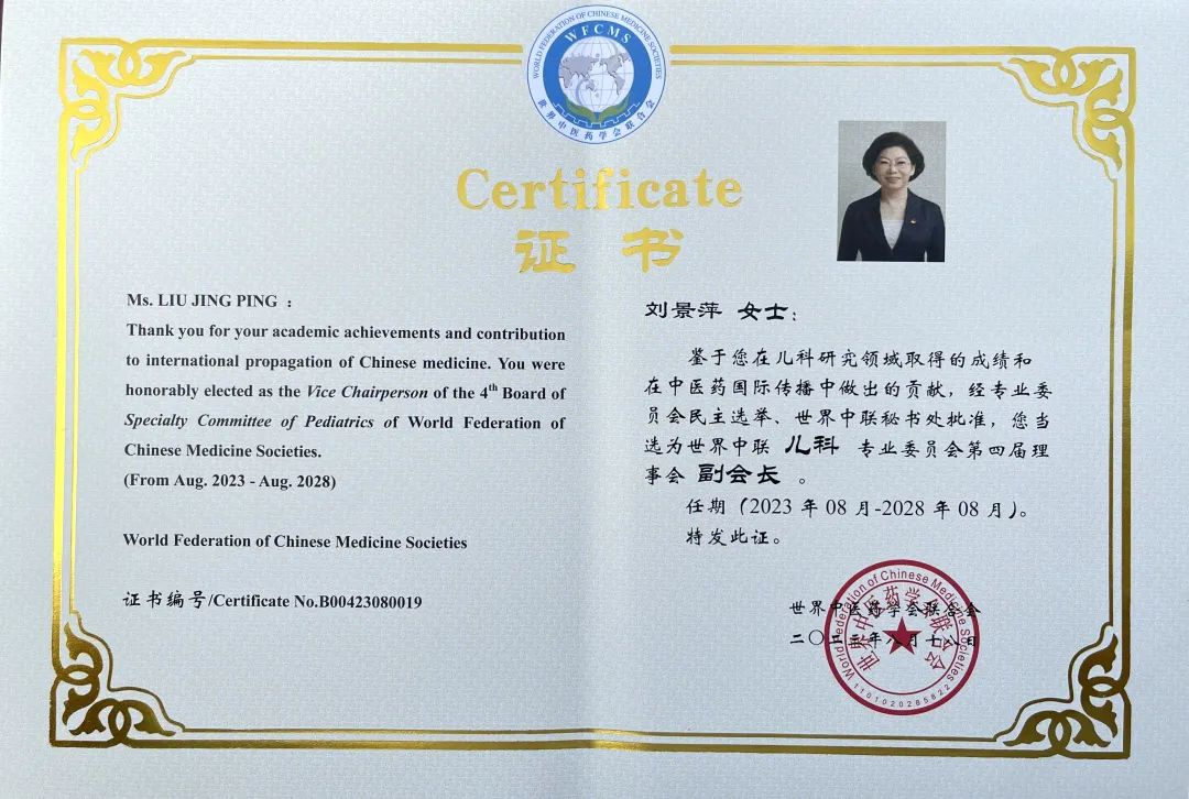 球速体育药业集团党委书记、董事长刘景萍当选世界中医药学会联合会儿科专业委员会第四届理事会副会长